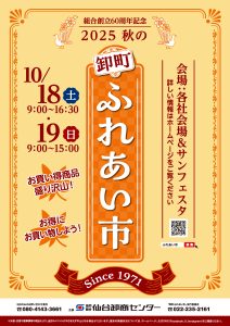 2025秋の卸町ふれあい市開催決定! 2025秋の卸町ふれあい市を10月18日(土)・19日(日)の2日間開催いたします! 詳細につきましては、随時HP等でお知らせしていく予定です。 皆様お誘い合わせの上、ぜひご来場ください。 ※天候・災害や諸事情により、当日のイベントがやむをえず中止となる場合がございます。 直前の開催状況についてはHP・各SNS(Facebook、Instagram、X(旧Twitter))をご確認ください。 2025秋ふれあい市ポスター 【PDF 312KB】 【JPEG 1.2MB】