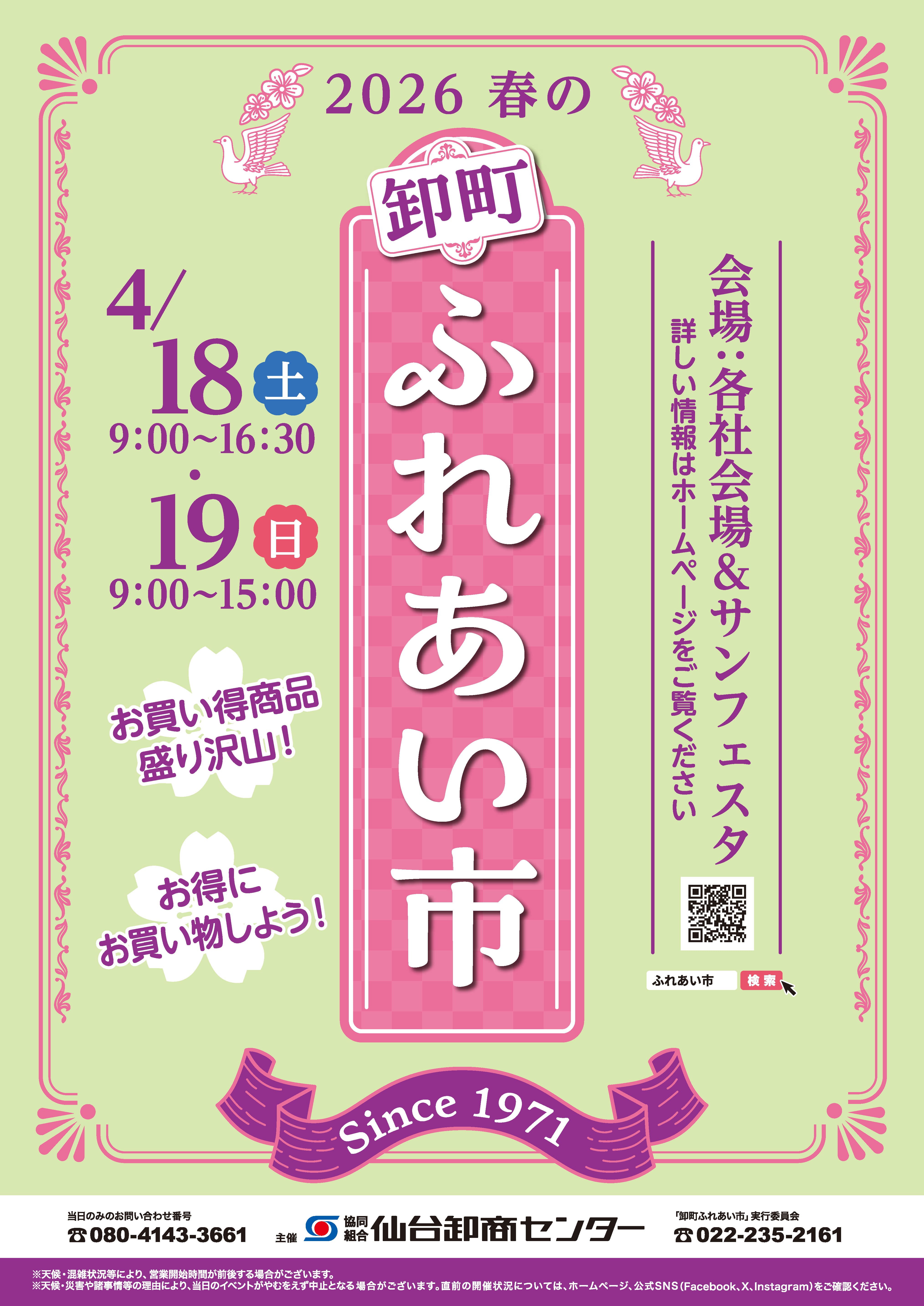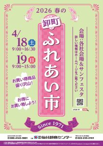 2026春の卸町ふれあい市開催決定! 2026春の卸町ふれあい市を4月18日(土)・19日(日)の2日間開催いたします! 詳細につきましては、随時HP等でお知らせしていく予定です。 皆様お誘い合わせの上、ぜひご来場ください。 ※天候・災害や諸事情により、当日のイベントがやむをえず中止となる場合がございます。 直前の開催状況についてはHP・各SNS(Facebook、Instagram、X(旧Twitter))をご確認ください。 2026春ふれあい市ポスター 【PDF 345KB】 【JPEG 1.1MB】